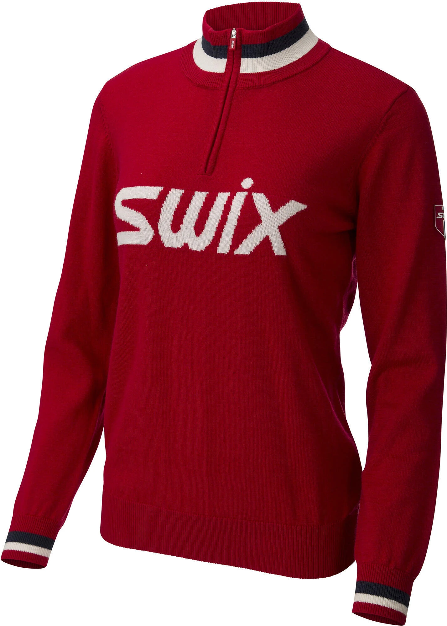 Swix Blizzard Logo ist ein fein gestrickter Wollpullover in klassischem Design. Er hat einen hohen Halsausschnitt mit Reißverschluss, um die Temperatur zu regulieren. Auf der Vorderseite ist ein großes Logo gestrickt und an den Bündchen und am Hals befinden sich retro-inspirierte Kontraststreifen!