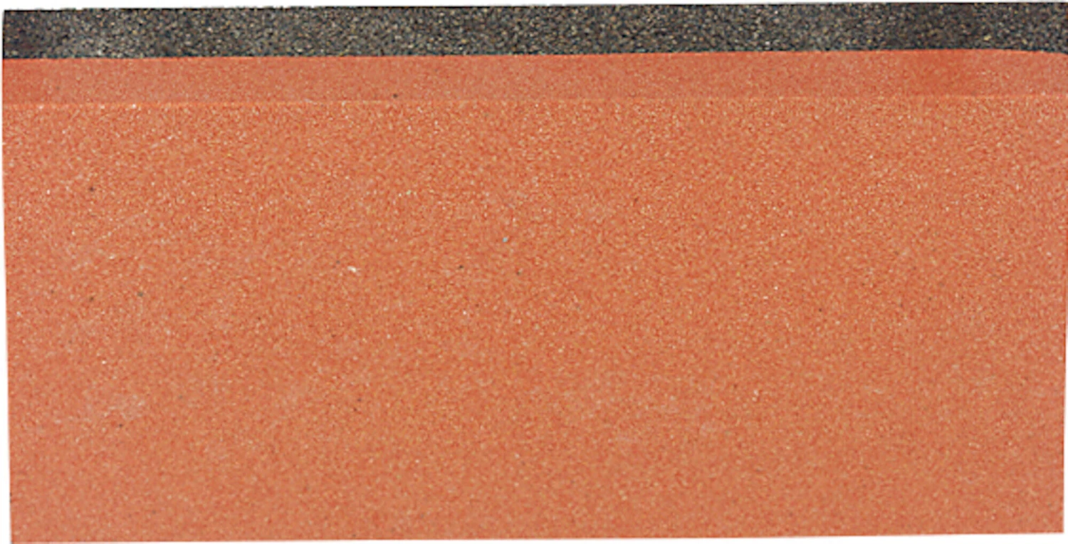 Doppelseitiger Schleifstein mit einer feinen und einer groben Seite. Die grobe Seite wird verwendet, um gehärtete Oberflächenschichten an Stahlkanten und Beschädigungen/Schnitte in Stahlkanten zu entfernen.